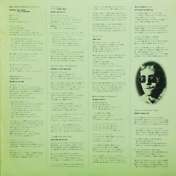 Comes in a tri-fold cover with brown/yellow obi strip.Includes 8-page green lyric/liner note insert & large folded "Rock Now" poster of Elton.