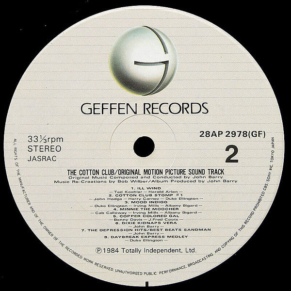 Soundtrack to [a=Francis Ford Coppola] movie "Cotton Club", starring Richard Gere, Gregory Hines, Diane Lane, Lonette McKee, co-starring Bob Hoskins, James Remar, Nicolas Cage, Allen Garfield and Fred Gwynne. Music by John Barry, Director of Photography Stephen Goldblatt, B.S.C., Costumes designed by Milena Canonero, Production Designer Richard Sylbert, Supervising Editor Barry Malkin, Producer Consultant Milton Forman, Co-Producers Sylvio Tabet and Fred Roos, Executive Producer Syson Lovell, Line Producer Barrie M. Osbourne & Joseph Cusumano, Story by William Kennedy & Francis Coppola and Mario Puzo, Screenplay by William Kennedy & Francis Coppola, Produced by Robert Evans. ⓒ 1984 ORION Pictures Corporation.Recorded and Mixed at A&R Recording and Clinton Recording using Sony and Mitsubishi digital recording equipement.