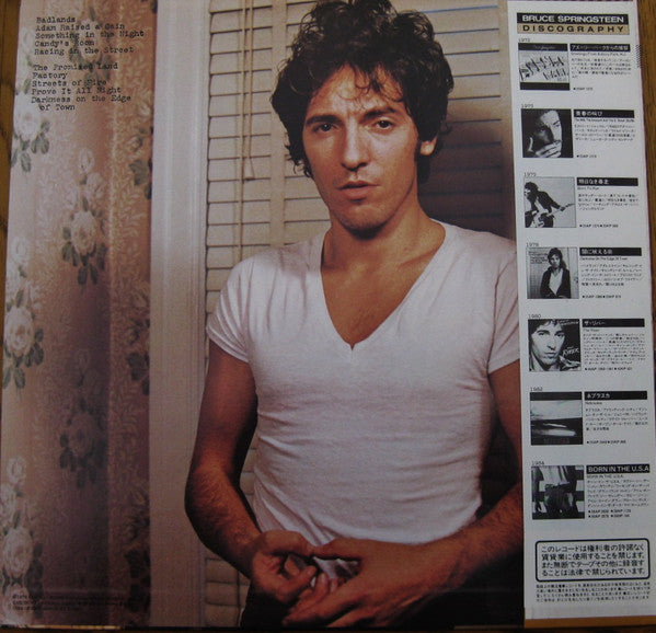 There are four Japanese issues of the "Darkness On The Edge Of Town" LP with the same catalog number. This is the 4th issue with brown vertical obi-strip, includes double-sided English lyric insert, 4-page Japanese lyric/liner notes insert, and printed glossy inner sleeve.Recorded and mixed at the Record Plant, N.Y.C.
