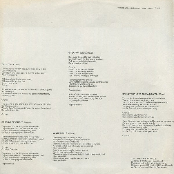 Yazoo - Upstairs At Eric's (LP, Album) - Very Good (VG) / Very Good (VG)