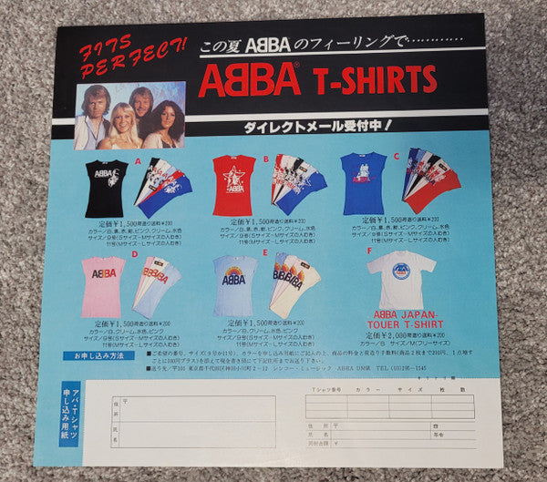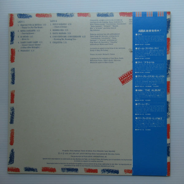 Red vinyl album features 10 of ABBA's hits and album tracks translated into Spanish and sung by the group. Gatefold insert has all Spanish lyrics, and lyrics translated into Japanese.Additional "ABBA T-SHIRTS" Promotional color insert.
