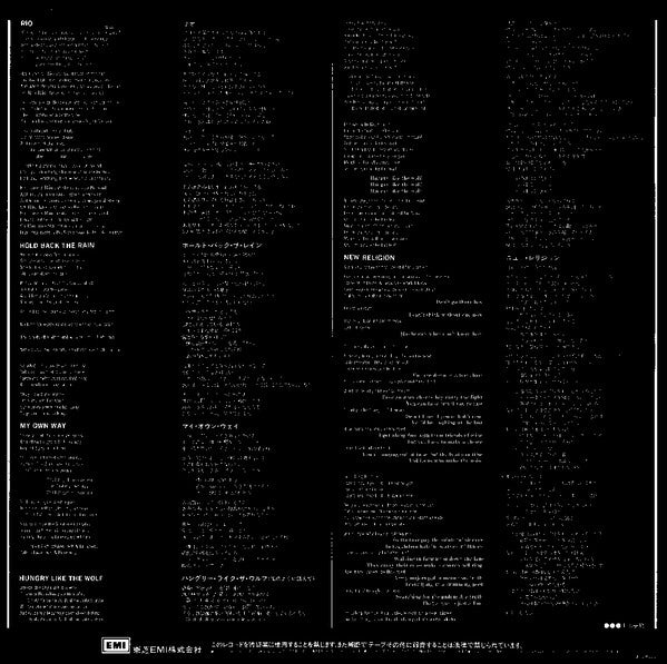 "Five Night Versions - Special 12 inch" on label.Comes with a lyric insert, obi strip on sleeve, colour picture sheet of band and sheet of stickers called 'British Invasion' hyping Duran Duran and other EMI acts.