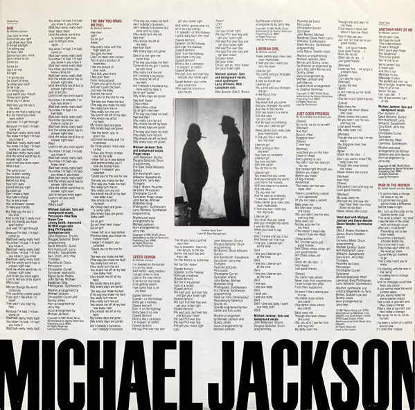 Comes with picture inner sleeve and 4-pages lyrics insert.℗&©1987 MJJ Productions Inc.