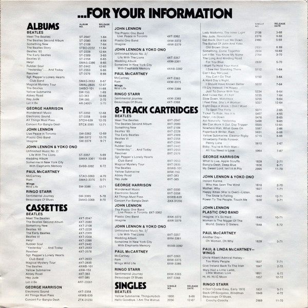 Came with white insert track sheet for both 62-66 and 67-70 albums with "for your information" discography of US Beatles and solo released up to spring 1973.