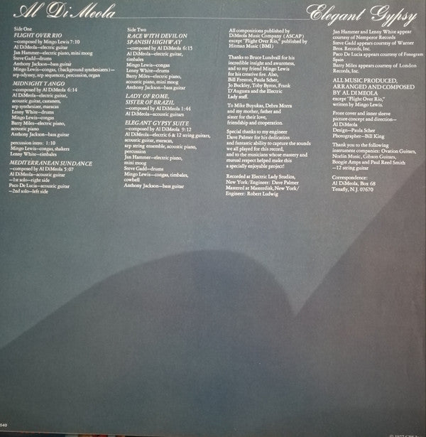 Includes printed inner sleeve with credits.All compositions published by DiMeola Music Company (ASCAP) except "Flight Over Rio," published by Hitman Music (BMI).