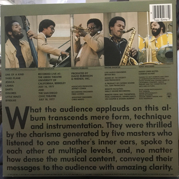 Recorded live at: The Greek Theatre University of California, Berkeley, July 16, 1977 and The San Diego Civic Theatre, July 18, 1977.Red columbia labels with Columbia in white at the top. No V.S.O.P. stamp on the cover.