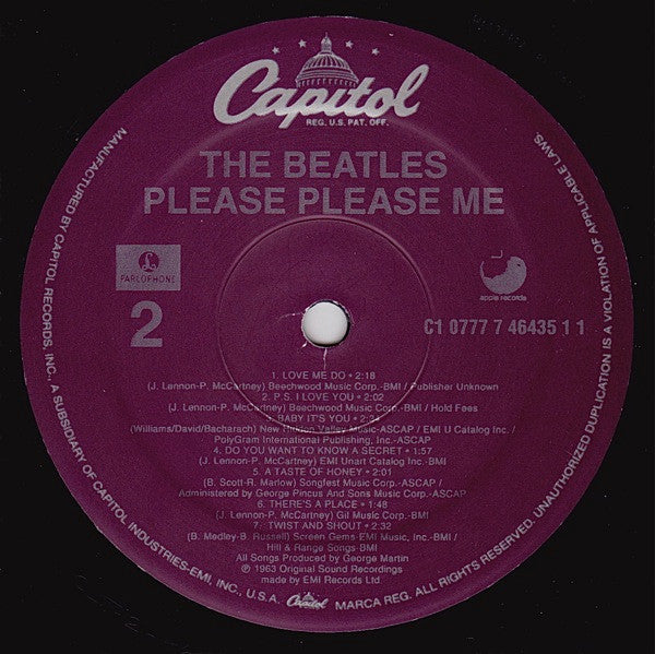 -Purple Capitol label design with the Parlophone logo on the left side of label above the “1” and “2” and Apple logo on the right.