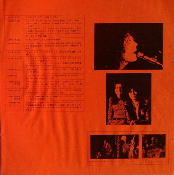 First original Japanese pressing includes black and white live poster, 12-page colour booklet (in Japanese) with lyrics, history of T.Rex and photos. Plus x-mas card, obi, and narrow yellow "大型ポスター付!!" (includes big poster!!) obi.