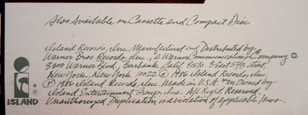 © & ℗ 1986 Island Records Inc.Label-27576 - Denoted by An "E A S T" embossed around the center hole (although some may lack the embossed 'E A S T' around the label)