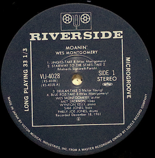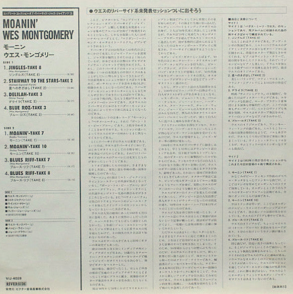 WES MONTGOMERY Moanin' (1983 Japanese-only 8-track stereo vinyl LP of previously unissued 1963 recordings and alternate takes from Montgomery's first session for Riverside. Unique picture sleeve complete with Japanese text insert & obi-strip VIJ-4028).Barcode and Other Identifiers