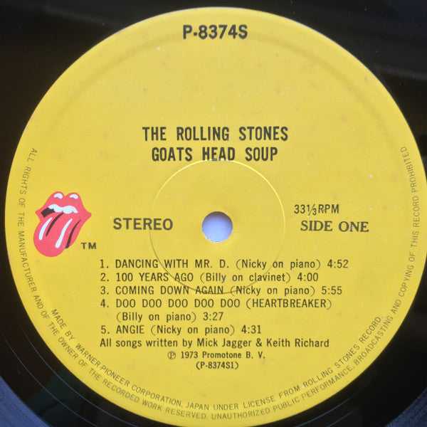 Gatefold sleeve with red & white obi, beautiful "super gloss" Goats Head print, printed sepia tone inner sleeve, and 4-page insert featuring Japanese liner notes, English lyrics, and mini-discography showing 4 other Rolling Stones Records releases (P-5046S, P-8091S, P-8152S, P-5051~2S).℗ © 1973 Promotone B.V. Printed in Japan