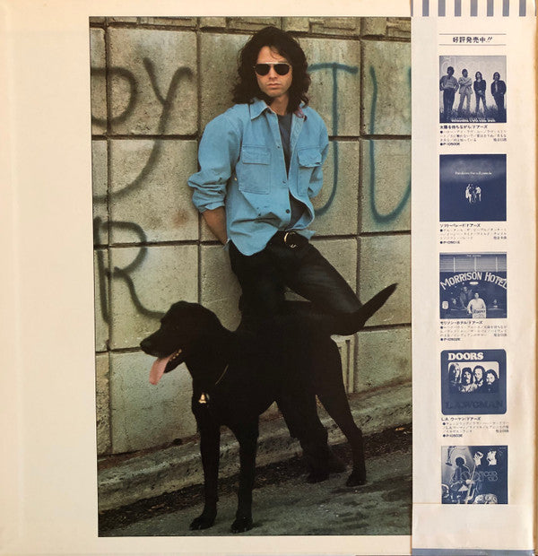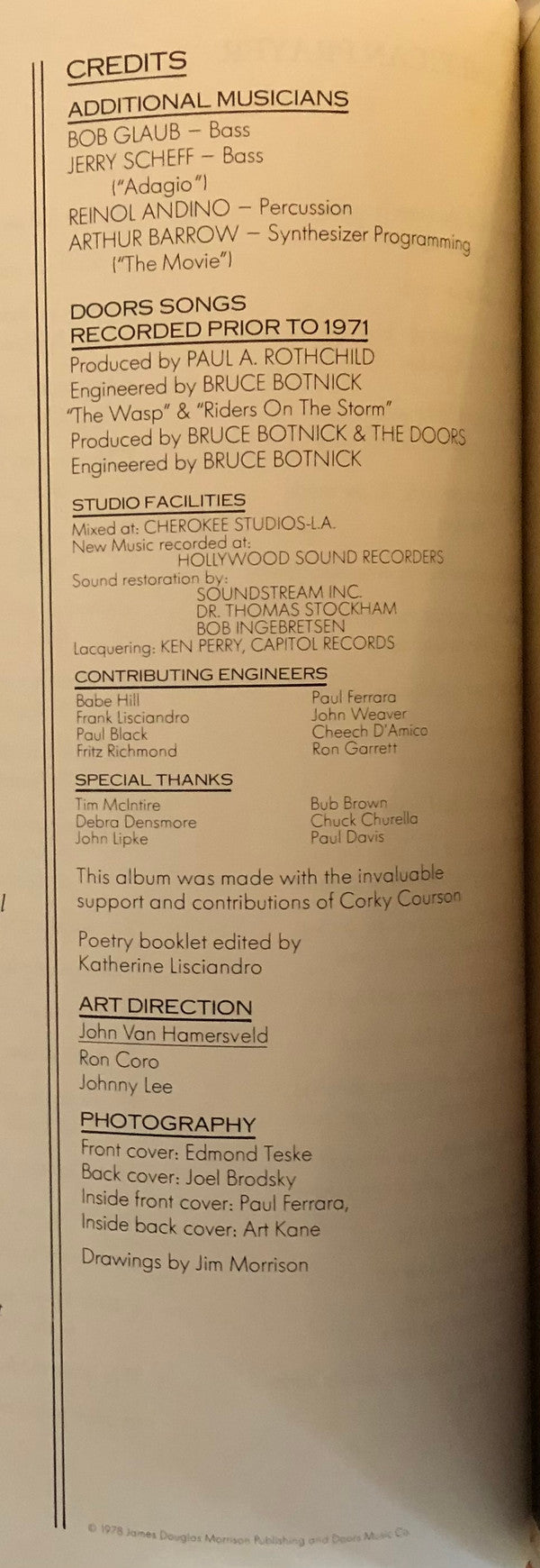 Glossy gatefold jacket containing 2 photos of Jim Morrison & an 8-page book with lyrics, and plastic transparent inner sleeve.