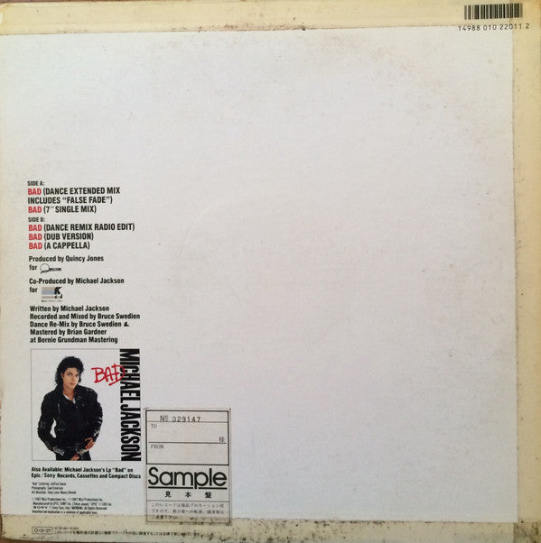 Michael Jackson - Bad (12", 45 RPM, Maxi-Single, Promo) - Near Mint (NM or M-) / Very Good (VG)