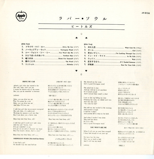 Toshiba Musical Industries Ltd.Includes obi ("Forever" series green obi -1972- or arrow in dark green obi with Apple logo -1970) and lyric sheet.