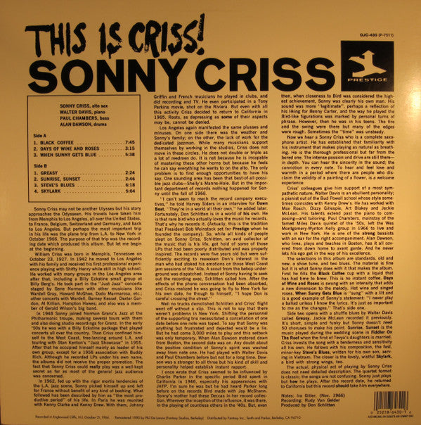 Sonny Criss - This Is Criss! (Vinyl, LP, Album, Reissue, Remastered) Very Good Plus (VG+) / Very Good Plus (VG+)