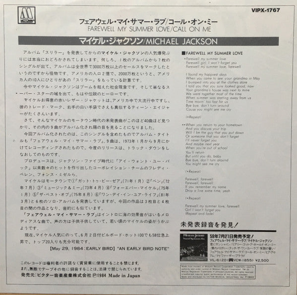 Michael Jackson - Farewell My Summer Love (Vinyl, 7", 45 RPM, Single) Near Mint (NM or M-) / Near Mint (NM or M-)