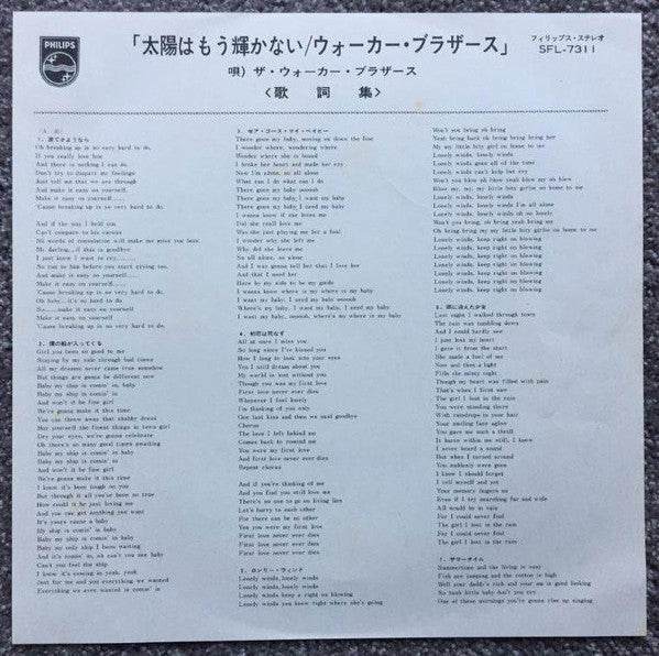 The first Walker Brothers' album in Japan.Laminated, flipback cover with obi (note different obi to Release-6366180) and 2-page insert with English lyrics to songs.