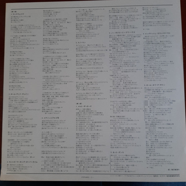 Front and back embossed, semi-gloss textured cover with obi and two, two-page inserts. One insert is the UK (English) insert, the other is a Japanese insert with Japanese and English tracklistings, track times, Japanese language liner notes on page 1 and Japanese lyrics to songs on page 2. Japanese language liner notes are dated 19th February 1982.Runouts stamped