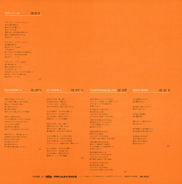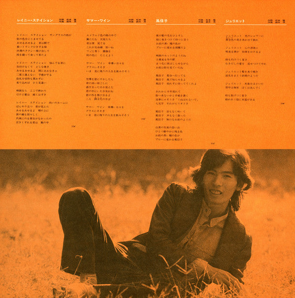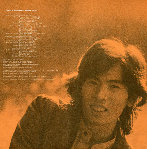 Obi states that this is Suzuki's third solo album. Recording dates 23 Sep - 23 Nov 1977.Special thanks to Seji Kuniyoshi, Hideki Matsutake, Shinji Kurata