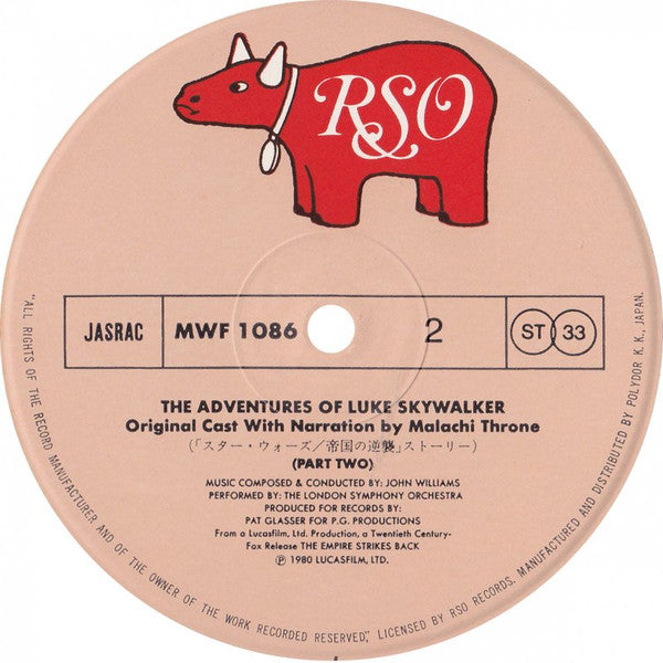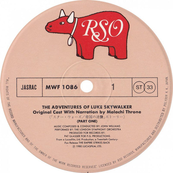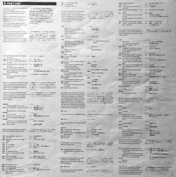Issued in heavy gatefold cover with obi, double-sided Japanese liner note & credits insert, and 4-page dialog script in both English & Japanese.Recording from the movie "Star Wars: Episode V - The Empire Strikes Back" directed by Irvin Kershner; featuring the voices of the original cast.