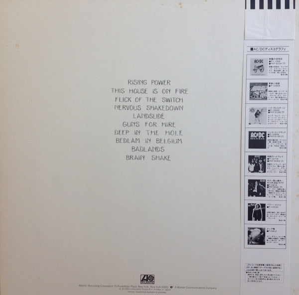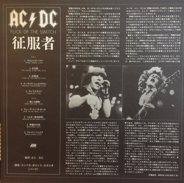 Comes in an embossed cover with an obi and 2 insert sheets. The first is the Japan only insert sheet with monochrome photos Brian and Angus, the track list, liner notes by Masa Itoh and English lyric transcriptions on the other side.. The other insert has the credits like the paper innersleeve bag of other releases around the world but in single sheet form because most records in Japan come in soft plastic inner bags instead of rough paper innersleeve bags.Japanese album title reads 'Seifukusha', meaning 'Conqueror'. but is also a pun on the word 制服(uniform) which is also vocalized as Seifuku. A play on Angus school uniform which is called seifuku.