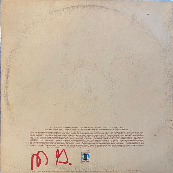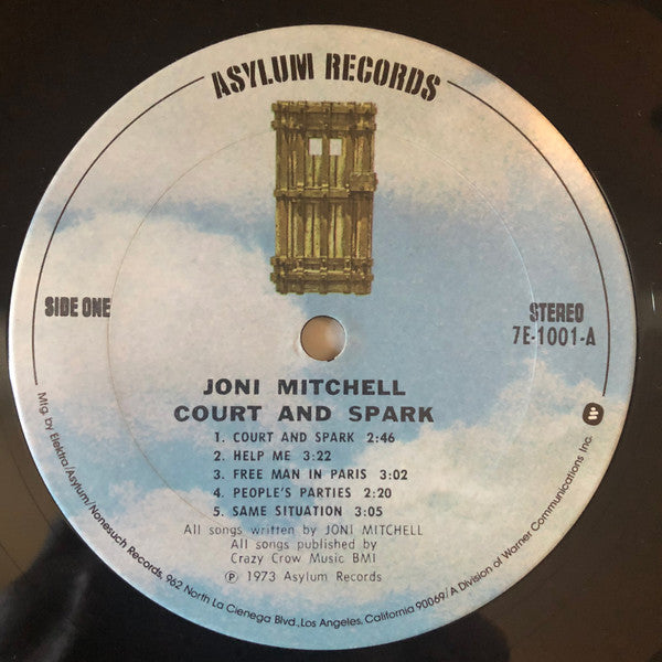 The crossed out catalog number in the runouts, SD 5072, would have been the catalog number if the independent Asylum Records had continued distribution through Atlantic Records. However, 'Court And Spark' was the first release under the newly formed Elektra/Asylum pairing, post buyout and reorg, initiating the new series as catalog number 7E-1001.