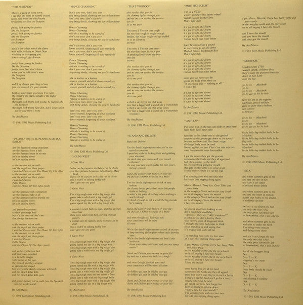 Gatefold sleeve with large gold obi strip.Includes foldout Japanese/English lyric sheet and large A1 single-sided poster of Adam Ant.