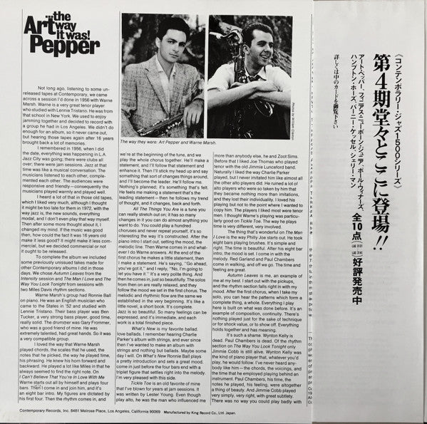 Liner Notes by Art Pepper, told to Laurie Miller Sept. 13, 1972. (Laurie Miller is a free-lance photographer and writer with whom Art Pepper is working on his autobiography.