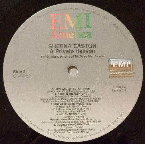 Sheena Easton - A Private Heaven (Vinyl, LP, Album, Stereo) Good Plus (G+) / Good Plus (G+)