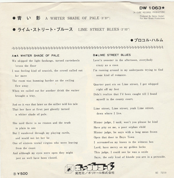 Procol Harum - 青い影 = A Whiter Shade Of Pale (Vinyl, 7", 45 RPM, Single, Reissue, Mono) Very Good Plus (VG+) / Very Good (VG)