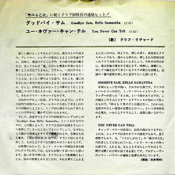 Cliff Richard - Goodbye Sam, Hello Samantha / You Never Can Tell (Vinyl, 7") Very Good Plus (VG+) / Very Good Plus (VG+)