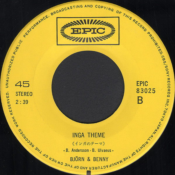 Both songs from the film soundtrack 'Inga II' aka 'The Seduction Of Inga' (no reference on this Japan release however). Originally released in Sweden on Polar Music International AB in 1970. Artist names also appear as 'ビヨルン&ベニー' in Japanese writing on the front cover.A-side in Mono, incorrect duration 3:11 on label.