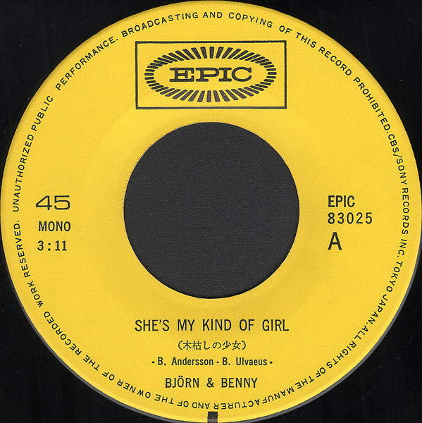 Björn Ulvaeus & Benny Andersson - 木枯らしの少女 = She's My Kind Of Girl / インガのテーマ = Inga Theme (Vinyl, 7", 45 RPM, Single, Stereo, Mono) Very Good (VG) / Very Good (VG)
