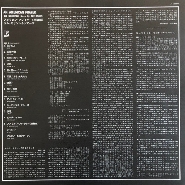 Glossy gatefold jacket containing 2 photos of Jim Morrison & an 8-page book with lyrics, and plastic transparent inner sleeve.