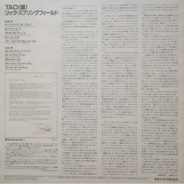 Rick Springfield - Tao (Vinyl, LP, Album) Very Good Plus (VG+) / Very Good Plus (VG+)