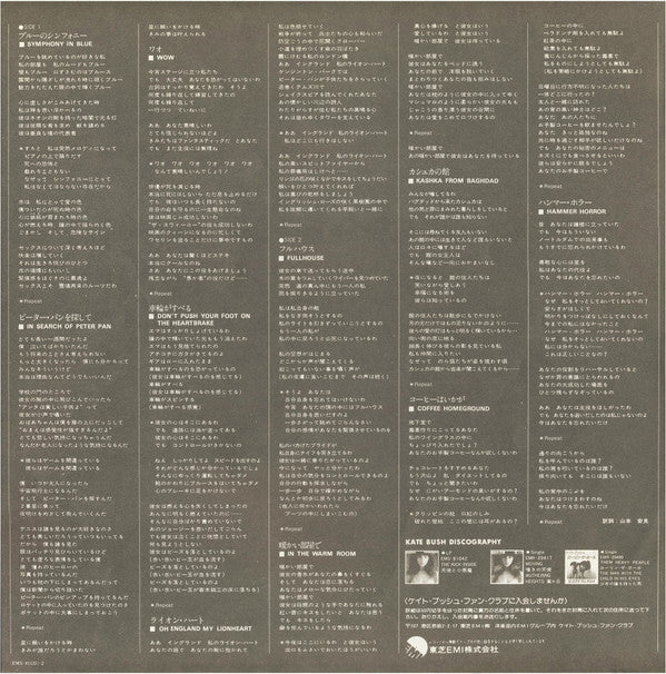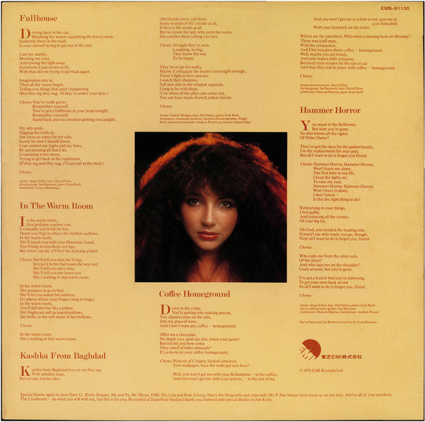 All lyrics reproduced by kind permission, published by Kate Bush/EMI Music Publ. Ltd. © 1978, lyrics in A2 by courtesy of Label-273333.