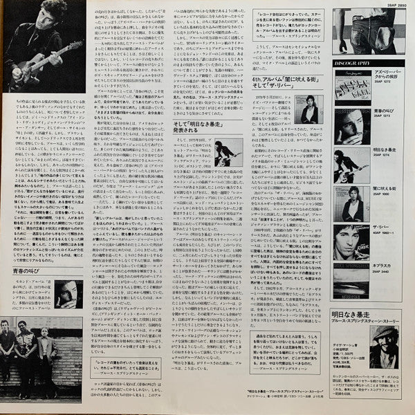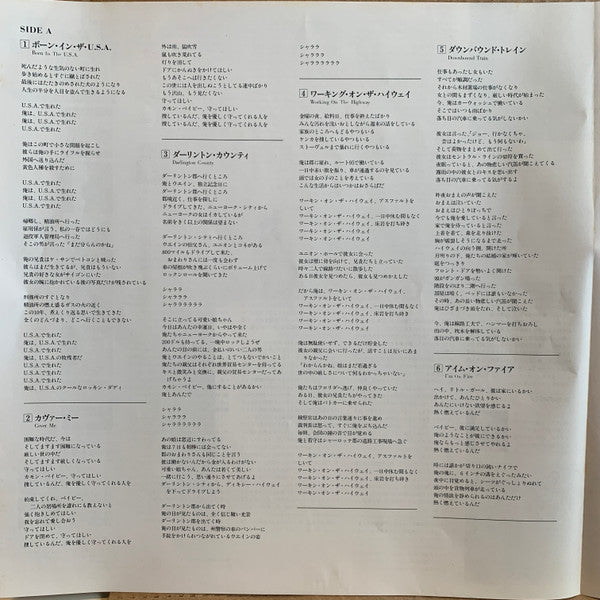 Comes with obi strip and a 4-page color English lyrics insert plus a 4-page black and white Japanese liner notes and lyrics insert.2nd Japanese issue of the album, the difference being in the black Japanese title lettering on the obi as opposed to the blue Japanese title lettering on the first issue as well as the artist name BRUCE SPRINGSTEEN at the top of obi as opposed to the album title BORN IN THE USA found on the first issue obi: [r=1682392]