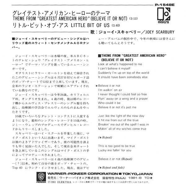 Joey Scarbury - Theme From "The Greatest American Hero" (Believe It Or Not) (Vinyl, 7", Single) Very Good Plus (VG+) / Very Good Plus (VG+)