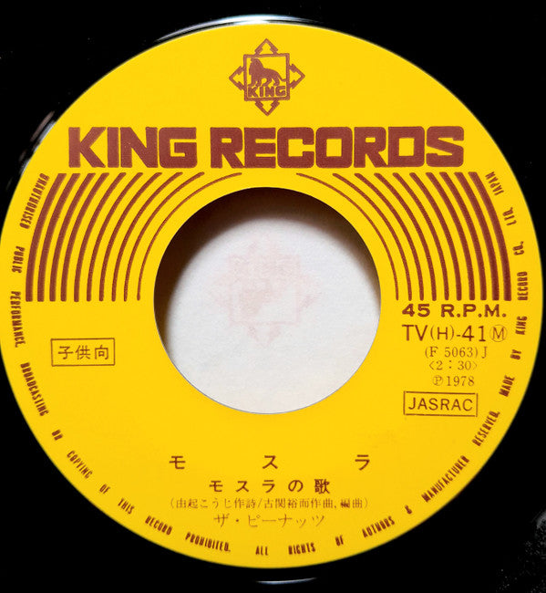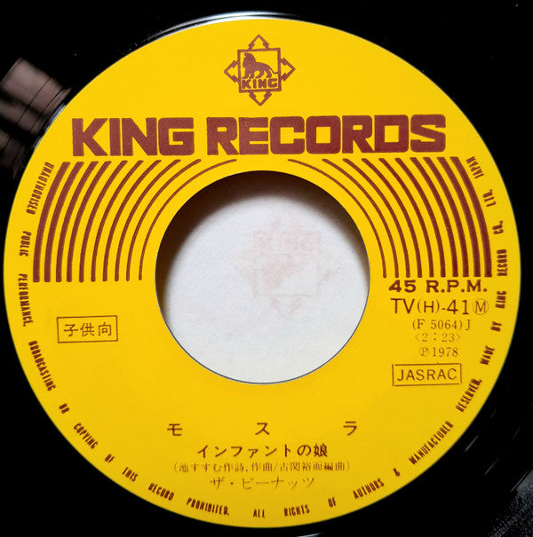 Two insert songs performed by The Peanuts in the film Godzilla Vs Mothra (1964) issued as King Records OST 7" in 1978.A version with a different label JASRAC logo.