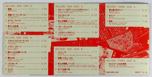 Misprint: E2 is 'Mr. Udo' but all artwork states incorrectly 'Savor'.Albums housed in die-cut inners with Santana Lotus logos on each.