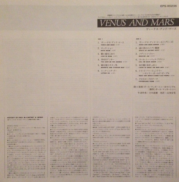 Came with Two fold out posters, a 'Venus And Mars Are Alright Tonight' round sticker and a 'Planets' strip stickerObi has Capitol & MPL logos in green at bottom. Another similar issue has them in black: [r=4019995]
