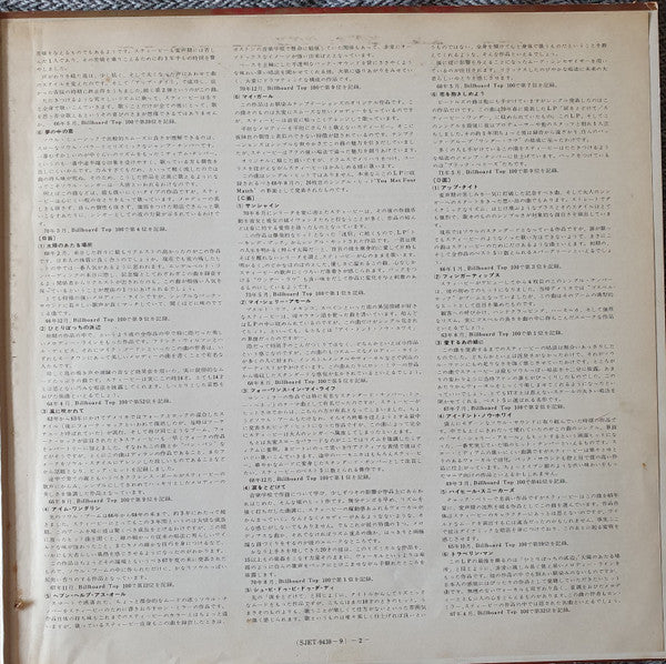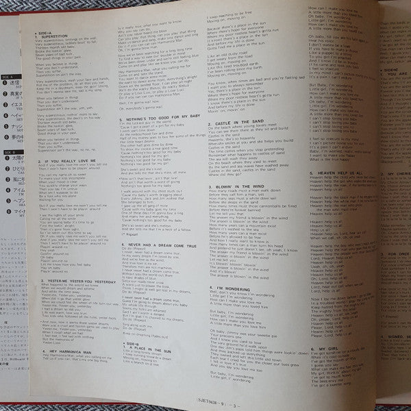 Similar to other [m1021145] releases, but completely different sleeve. Red and gold print with "Stevie Wonder" written in bubbles around the upper right corner of the sleeve. Not confirmed if this release originally came with an obi.Gatefold sleeve with single paper page with lyrics printed on both sides.