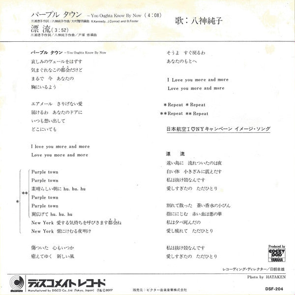 Junko Yagami - パープルタウン = Purple Town (Vinyl, 7", 45 RPM, Single, Repress, Stereo) Very Good Plus (VG+) / Very Good Plus (VG+)