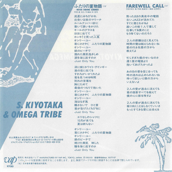 S. Kiyotaka & Omega Tribe - ふたりの夏物語 - Never Ending Summer (Vinyl, 7", 45 RPM, Single) Very Good Plus (VG+) / Very Good Plus (VG+)