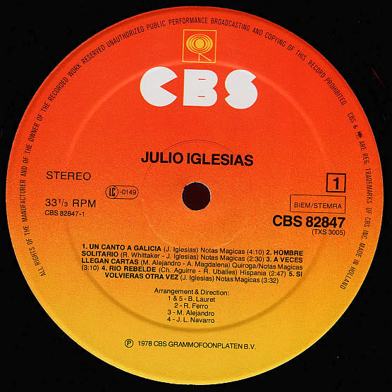 Julio Iglesias - Por Una Mujer (Vinyl, LP, Album, Reissue, Stereo) Very Good Plus (VG+) / Very Good (VG)