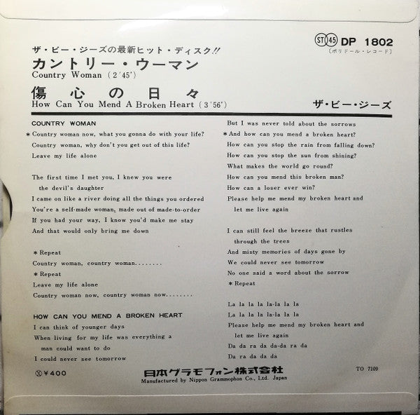 Bee Gees - Country Woman / How Can You Mend A Broken Heart (Vinyl, 7", 45 RPM, Single, Stereo) Very Good Plus (VG+) / Very Good (VG)