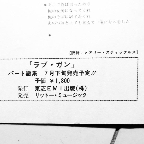 The inscription on the last page of the insert at the bottom right: 「ラブ・ガン」パート譜集7月下旬発売予定!!予価¥1,800発行東芝EMI出版(株)発売リットー・ミュージック ("Love Gun" Part Score Collection Scheduled to be released in late July !! Price ¥ 1,800 released Toshiba EMI Publishing Co., Ltd. released Rittor Music)