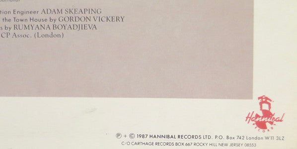 Recorded July 2 & 3, 1987 at the studios of Bulgarian Radio in Sofia.Otherwise identical to [r=1454469] but has an additional record company Carthage Records credited on the back cover like on the US version but without "Jacket printed in Canada".