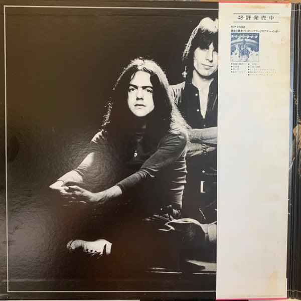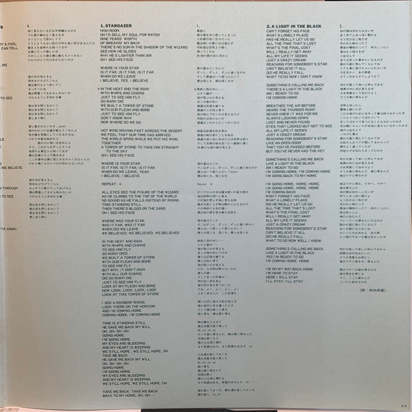 Subsequent 2nd version gatefold cover with narrower obi (without Limited Edition text/NO stars at top/bottom of obi), and NO poster. Includes a green-tinted 4-page insert featuring Japanese liner notes and lyrics in both English & Japanese, and double-sided full color "Polydor Rock 40 Best Albums" catalog insert.There are 2 versions of the green-tinted 4-page insert, with the differences seen on the Fan Club info in lower right on page 4/4: