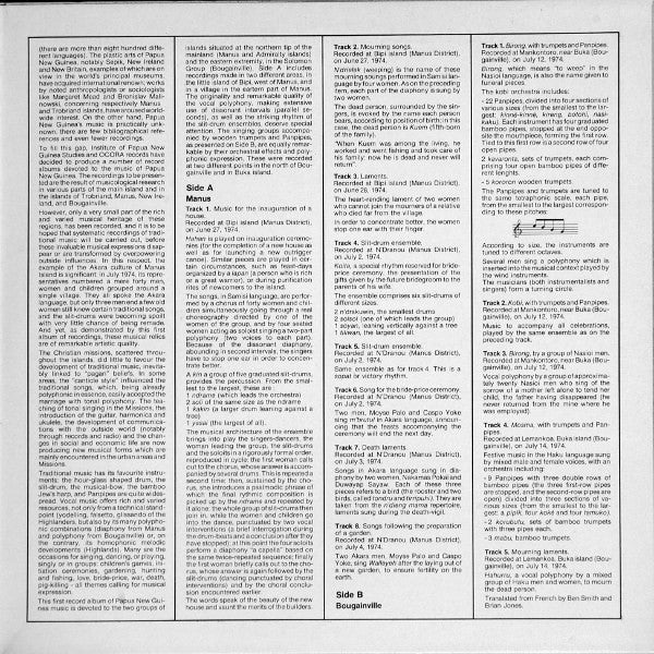 Songs and music from the Manus people, Admiralty Islands, and Bougainville Island.Recorded in the north of Bougainville and Buka Island between 27 June and 14 July 1974.